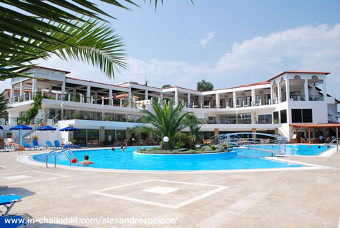 Hotelul este situat pe o panta verde din zona Tripiti, pe al treilea brat al peninsulei Halkidiki, Athos. Oraselul Ouranoupolis se afla la 5 minute de mers cu masina. Pe plaja cu nisip a hotelului, sezlongurile si umbrelele sunt gratuite daca se consuma ceva de la barul de pe plaja