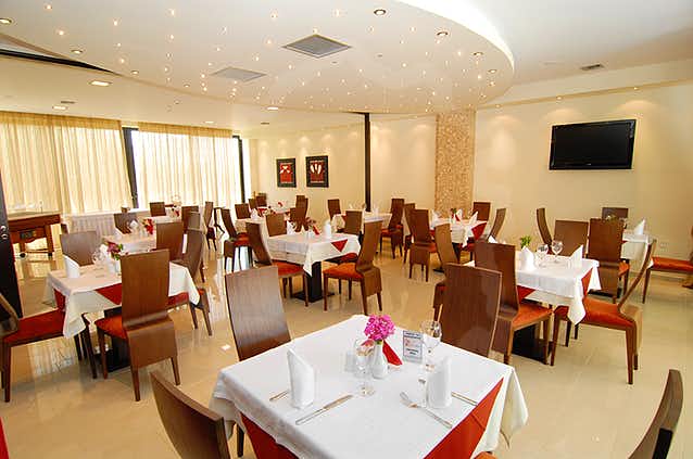 Hotelul ofera demipensiune - mic dejun bufet (08:00-10:00) si cina (19:00-22:30) meniu, la alegere dintr-o selectie de preparate. Periodic se organizeaza seri tematice. Hotelul are un restaurant si un bar la piscina.