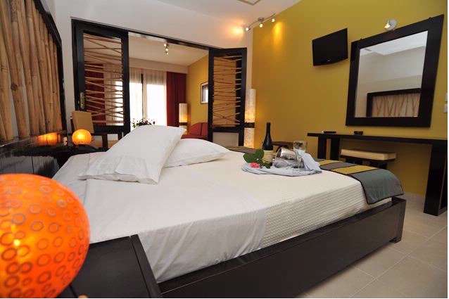 Hotelul dispune de 124 de camere spatioase, frumos si elegant amenajate. Un numar de 48 de camere standard si suite, se gasesc in cladirea pricipala la parter sau la primul etaj, cu vedere catre mare sau gradina, toate fiind spatioase si mobilate cu mult gus si finete. In cele sapte cladiri autonome ale bungalow-urilor, se găsesc 66 de camere comfortabile(cu doua paturi, cu trei paturi si suite), capabile sa gazduiasca pana la patru persoane. O cladire special construita si denumita Villa gazduieste alte 9 camere, toate cu vederea catre mare, pentru toti cei ccare prefera o izolare discreta si o cazare de lux. Fiecare camera si suita, dispune de: televiziune prin satelit , aer conditionat, telefon , sistemul de mesaje vocale, radio, acces la internet, bar-mini si casa de valori. Baile sunt decorate cu marmura, conectate la muzica si dispun de uscator de par. Balcoanele mari ale acestora sunt mobilate cu scaune si mese din bambus, pentru a admirasuperbele culori ale marii si ale gradinilor.
