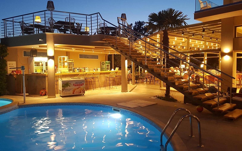 Hotelul ofera mic dejun (08:00-10:00) bufet in restaurantul principal. Restaurantul A la carte ofera preparate din bucataria greceasca si internationala, iar barul de la piscina ofera o gama variata de bauturi alcoolice si non alcoolice.