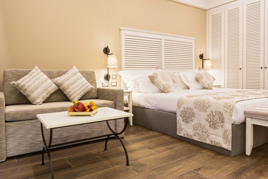 Toate cele 173 de camere au aer conditionat central, TV LCD cu intrari USB si HDMI, acces gratuit la internet WIFI, telefon, facilitati pentru prepararea ceaiului si a cafelei, o sticla de apa la sosire, minibar, baie cu cabina de dus, cada, oglinda de machiaj, uscator de par, halate si papuci, prosoape de plaja, seif, balcon sau terasa mobilata. Camerele duble au 35 mp. Apartamentele familiale au 45 mp si sunt compuse dintr-un dormitor si un living spatios, despartite de usa.
