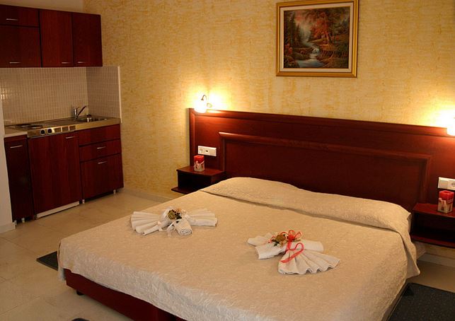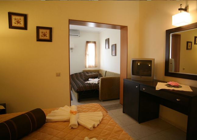 Toate camerele hotelului au chicineta, frigider, TV, aer conditionat, fierbator electric, toaster, seif (contra cost: 2 euro/zi, se achita la receptie), baie cu dus, acces la internet WIFI (contra cost: 2 euro/zi, se achita la receptie). Camerele duble au 21 mp si capacitate maxima de 2 adulti si 1 copil. Camerele Family cu paturi supraetajate au 21 mp si capacitate maxima de 2 adulti si 2 copii. Camerele Superior pentru 3 persoane au 25 mp, un pat dublu si o canapea sau 3 paturi single si un pat pliant, avand capacitatea maxima de 3 adulti si 1 copil. Camerele Sperior pentru 4 persoane au 25 mp, au 2 paturi single si 2 paturi suprapuse si capacitate maxima de 2 adulti si 2 copii sau 3 adulti.